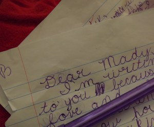 “Pajamas, purple ink pens, lined paper, a cup of yogurt—no—a carrot so it won’t melt under the blanket, ice water in a bottle, one of the red blankets—the small ones, not the short ones because those won’t cover my whole body, and a fan right over me so I don’t get hot under the blanket, and the flashlight so I can see.”