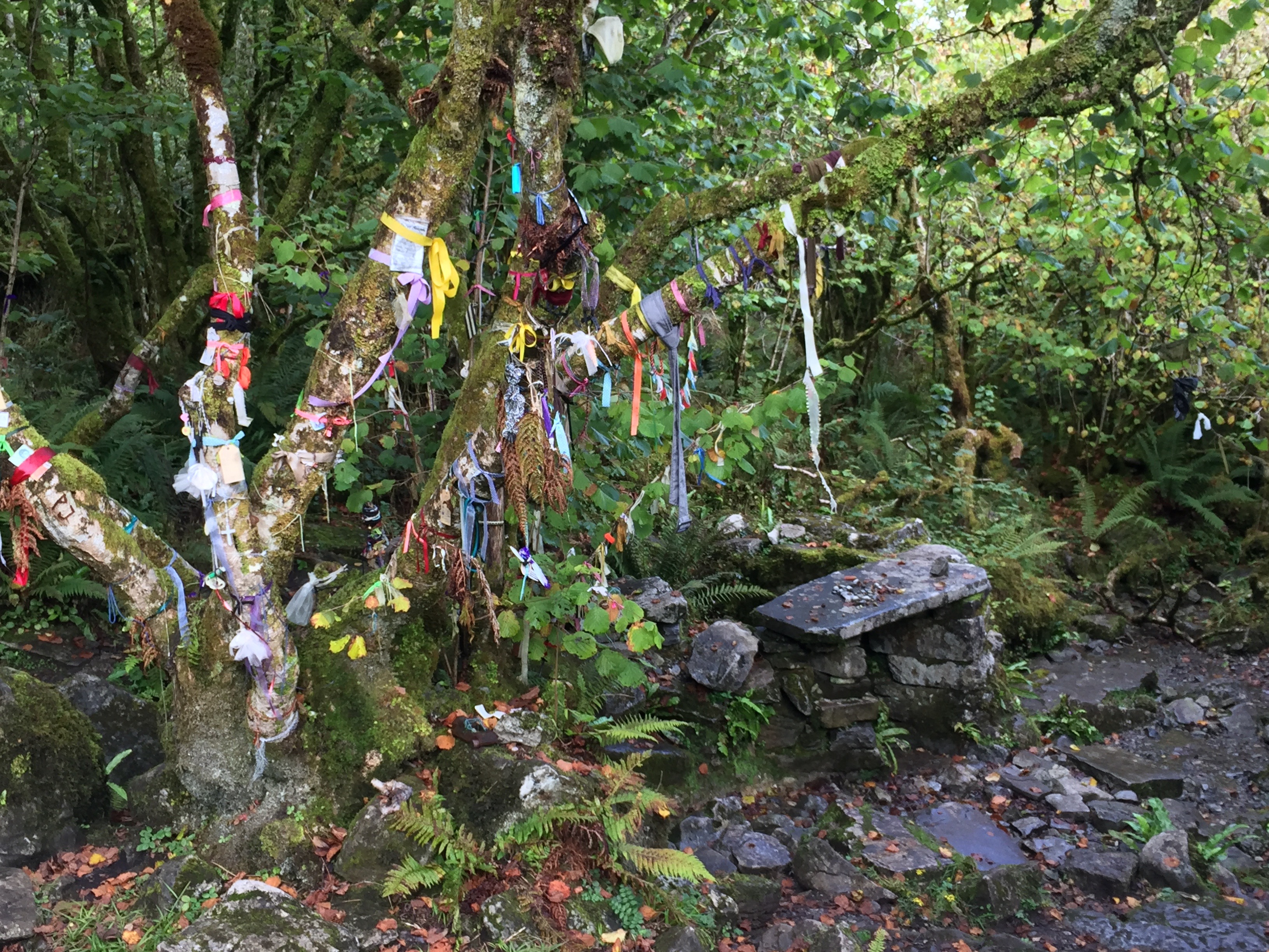 The holy well was beautiful and peaceful. Protected from the wind, it was filled with a soft, patient hush instead of being eerily silent. I swore I could see things hiding in the hazel surrounding me. While Neil scrambled up a steep dirt path to St Cronan’s cave (supposedly where the St slept), I circled the holy well several times thinking about all I had to pray for. Unknown to me, the path I walked had been created by the saint for the same purposes as the confined space in which he built his hermitage didn’t allow for the usual turas (making the rounds). The ancient skeleton of a hazel bush in the center of the circle was covered in ribbons and small trinkets that held the prayers of visitors that came there. Lacking any ribbon, I wound a distinctly grey hair from my own head around a branch. And since the guide book said the well was believed to cure back troubles, I dabbed a bit of the water on my lumbar region just in case.