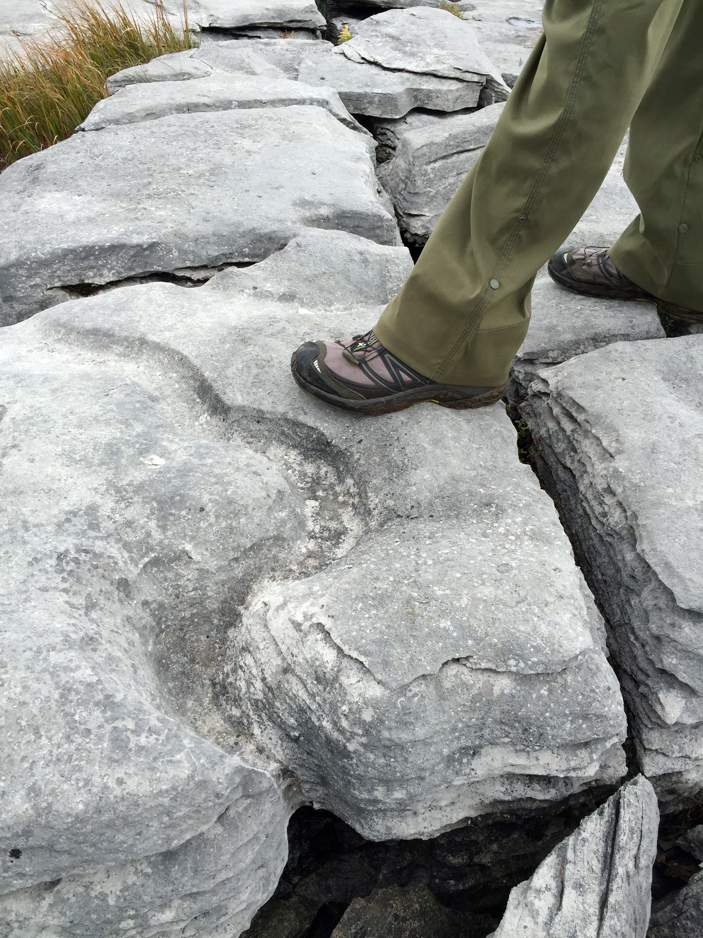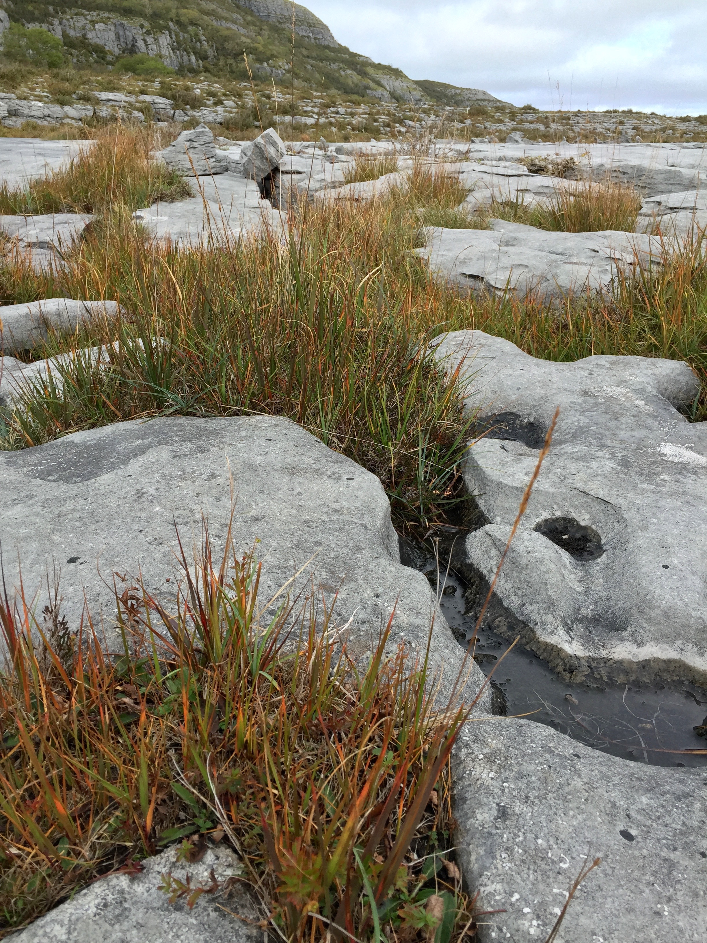 Tromping through surprisingly slippery mud, we circled around to a vast flat expanse of level stone, broken only by finger to palm wide fissures (grikes) in the stone. While we got down on our hands and knees to see what was hiding in their chasms, we could see how thin streams of water had carved out tiny riverbeds in the stones surface. Up close it was even more astonishing than the vast scenes of moonscape we circled around for hours.