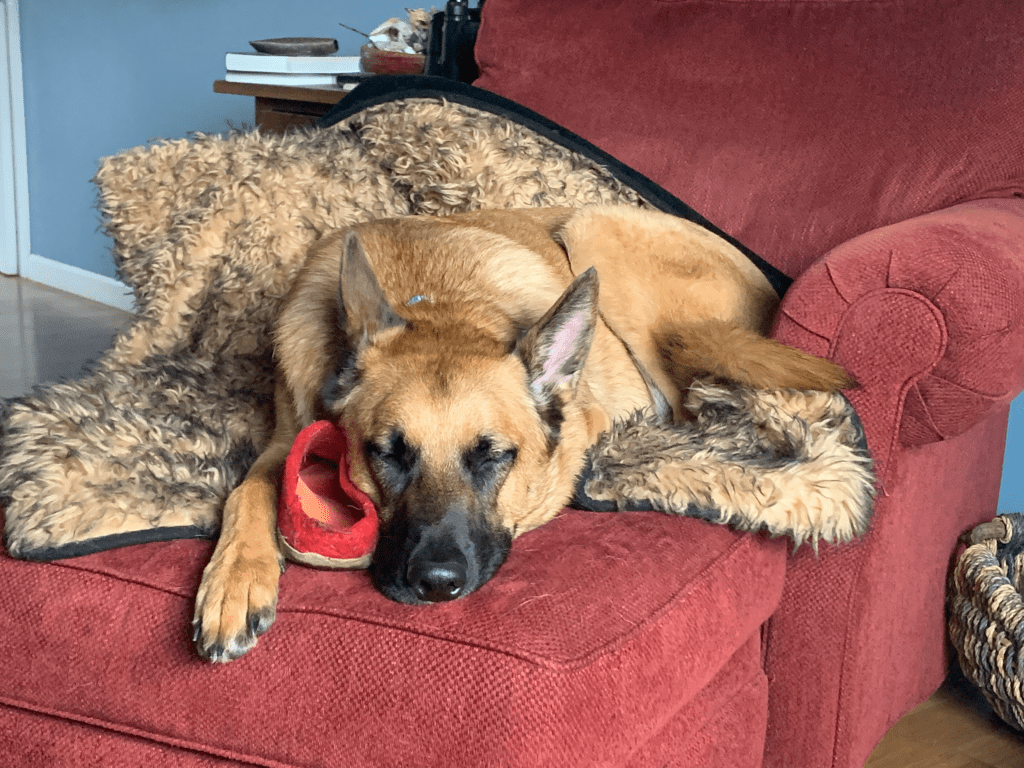 Turns out that Fionn the warrior-mystic dog is scared of the dark, and though he doesn’t mind loud noises like fireworks, the sound of paneling being torn off the studs sends him into a frenzy of concern. He can’t decide if he wants to hide or protect me, so we leave the door open and he sits in the grass watching me from a distance.